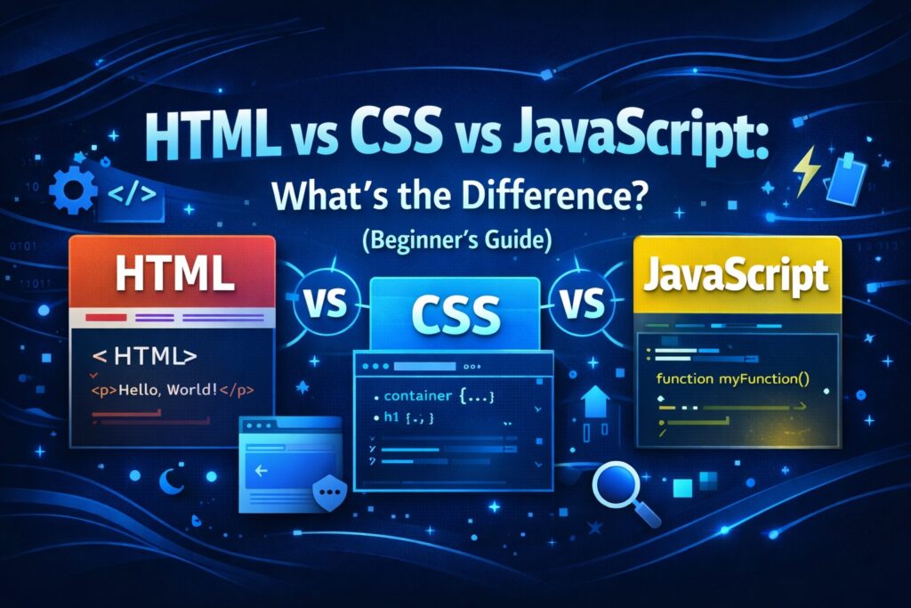 Introduction If you are new to web development, you’ve probably heard about HTML, CSS, and JavaScript. These three technologies form the foundation of almost every website on the internet. But beginners often get confused: In this beginner-friendly guide, we will clearly explain HTML vs CSS vs JavaScript, how they work together, real-life examples, and when […]